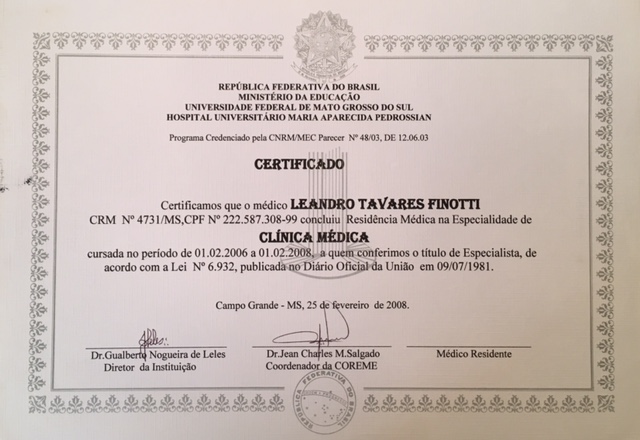 Residência Médica em Clínica Médica no Hospital Universitário Maria Aparecida Pedrossian (HUMAP-UFMS).